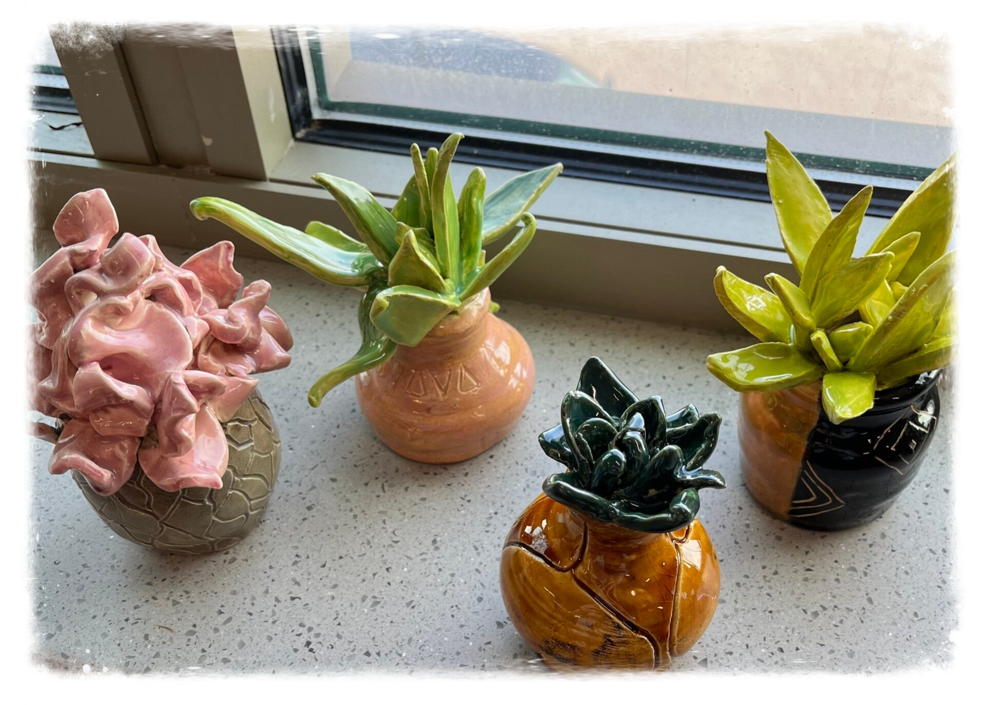 Discover our handmade original pottery, including dishes, magnets, cups, and plates. Some pieces even come with a plant. Inventory is limited, so visit our mobile shop! pictured above: part of the "un-killable" plant collection.