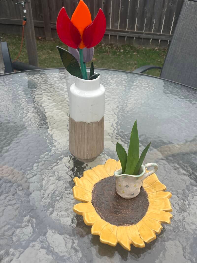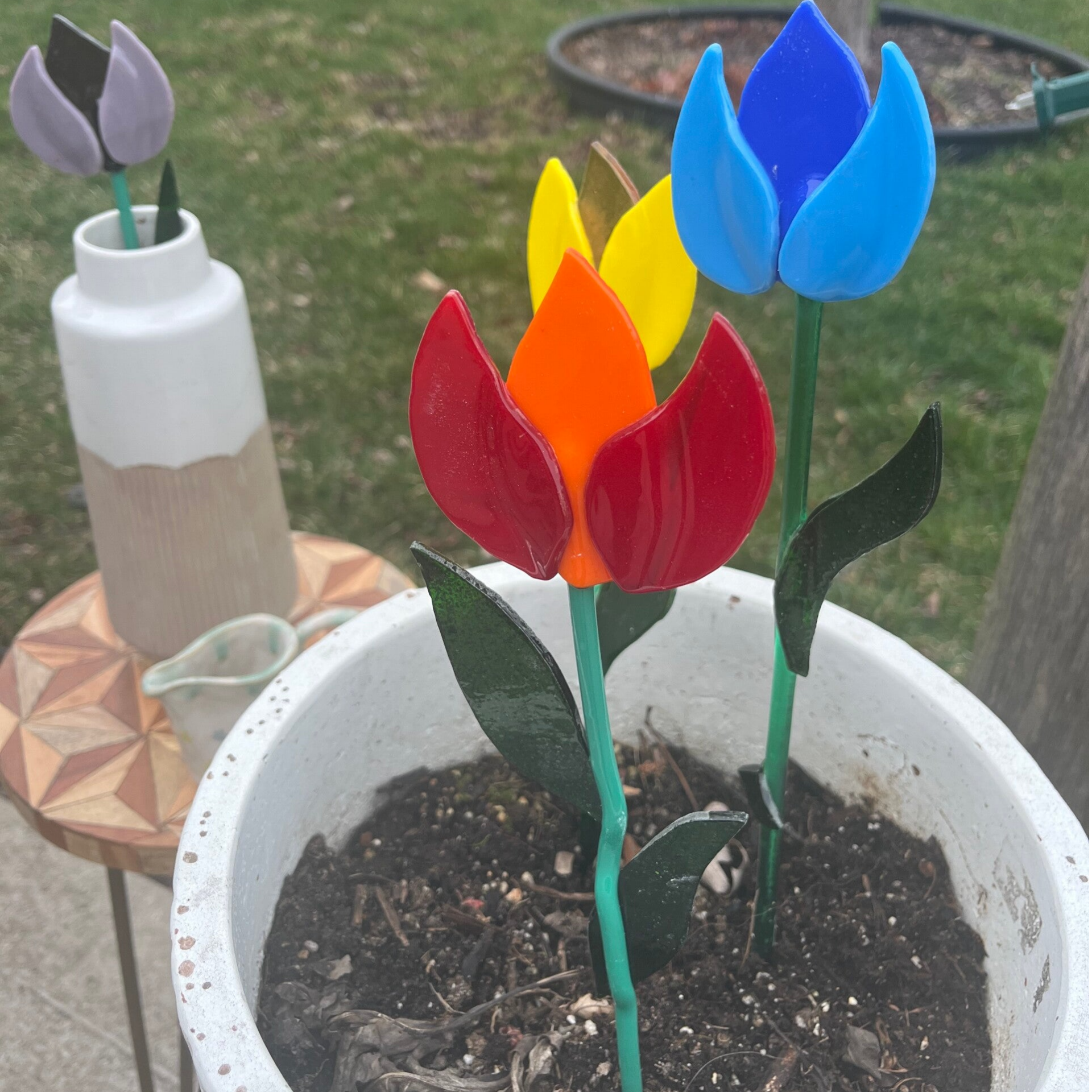 Stained glass sun catchers and glass flower stakes are a beautiful addition to any window or garden.